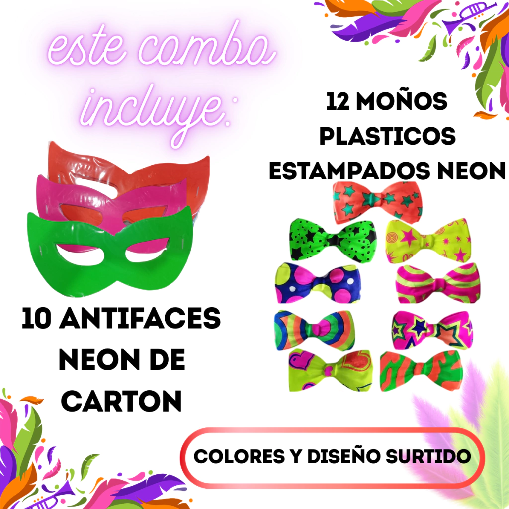 Dale un toque de color y diversión a tu fiesta con este combo de antifaces y moños neón, perfectos para el carnaval carioca, cumpleaños, casamientos y cualquier celebración. Los colores intensos y los estampados llamativos harán que todos se destaquen en la pista de baile.