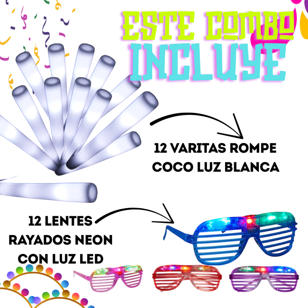 Dale un toque único y divertido a tu fiesta con este combo luminoso pensado para que todos disfruten al máximo. Con varitas rompe coco y lentes rayados de colores con luces LED, lograrás que tu evento tenga la mejor onda y que nadie se quede afuera de la diversión.