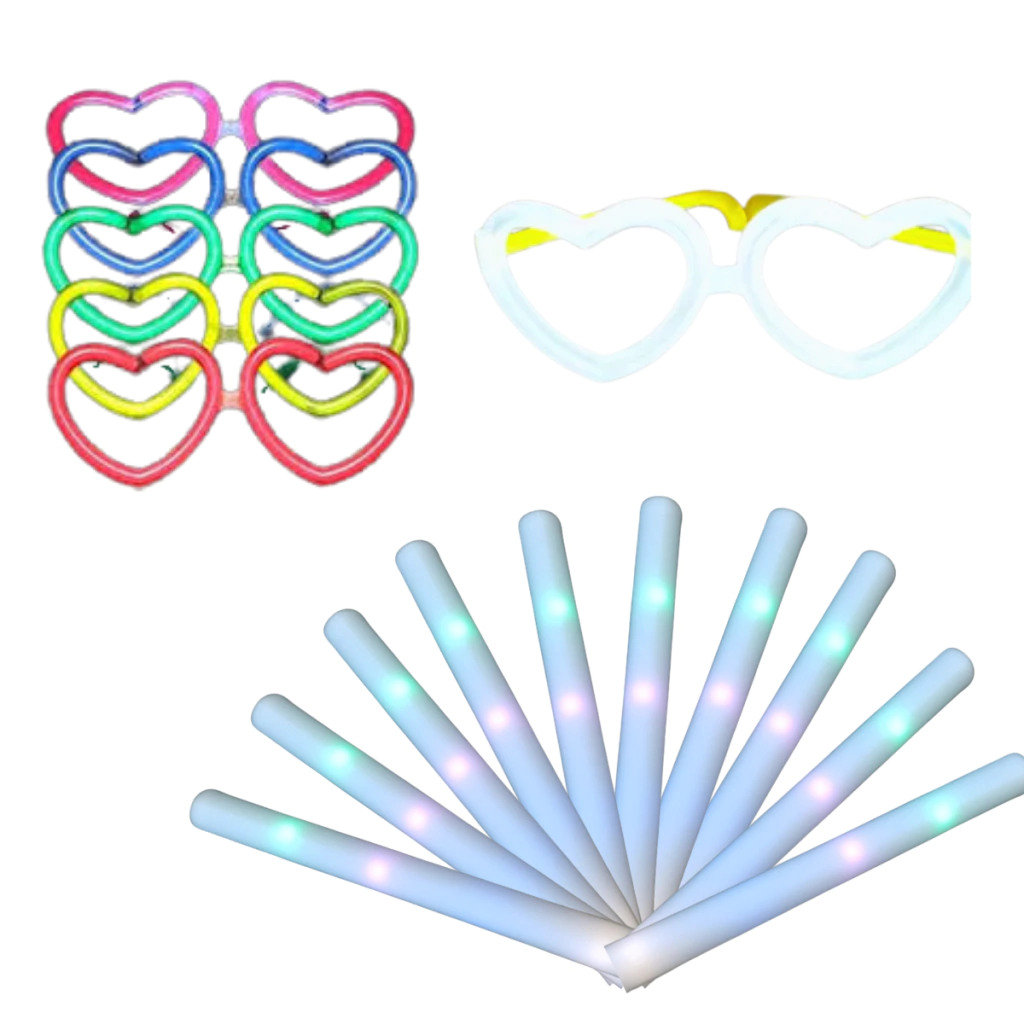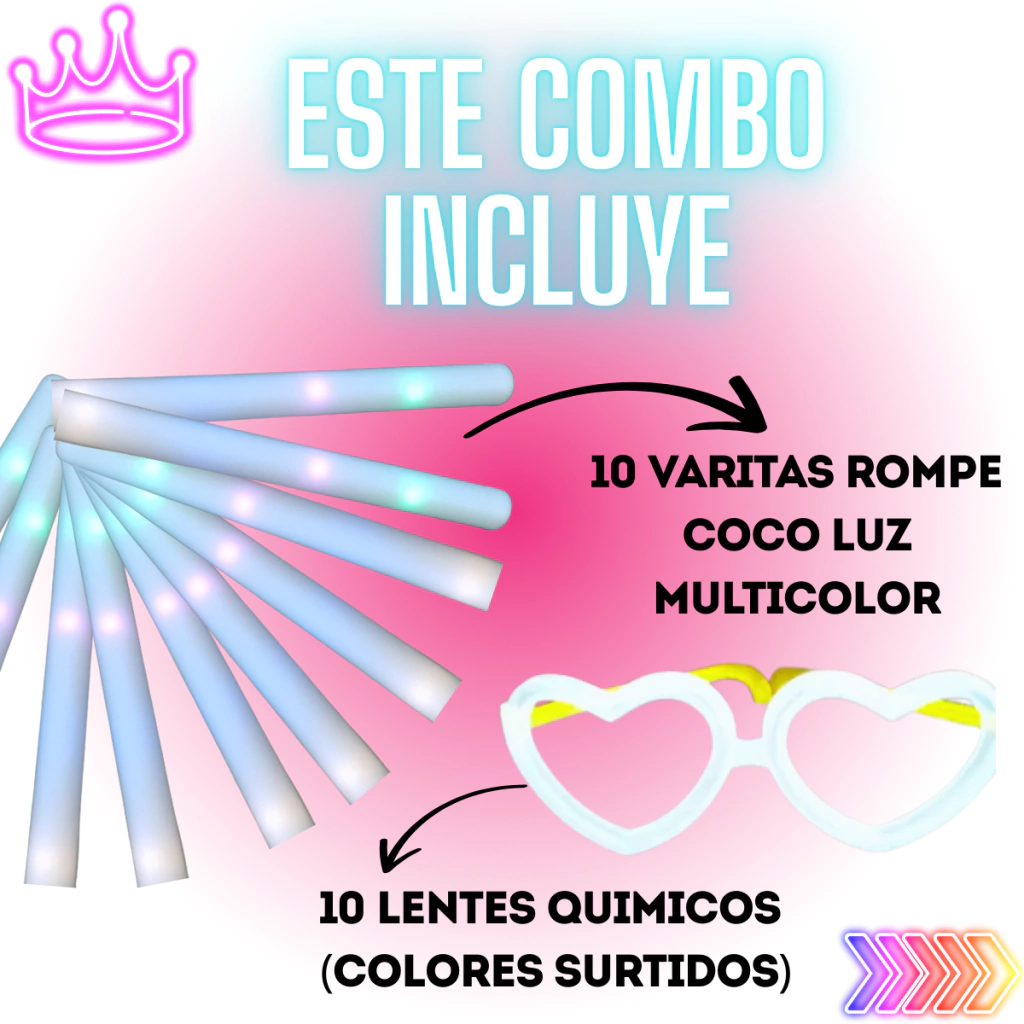 Dale a tu fiesta un toque único con este combo luminoso ideal para el carnaval carioca, casamientos, cumpleaños y eventos especiales. La combinación de varitas rompe coco con luz multicolor y lentes químicos en forma de corazón asegura diversión y fotos increíbles.