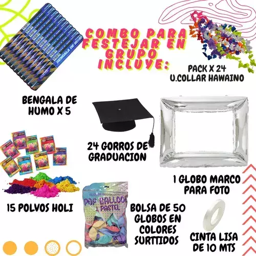 Incluye gorros de graduación para todos, polvos holi para lanzar color al aire, bengalas de humo que crean una entrada impactante, y un marco inflable para que no falten las fotos. Además, suma collares hawaianos para un toque festivo y colorido que todos van a disfrutar.