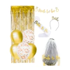 Los globos en tonos metalizados y con confeti aportan brillo y volumen; la cortina metalizada crea un fondo perfecto para fotos; y los accesorios para la novia —vincha, banda y velo— completan el look con un toque delicado y festivo.