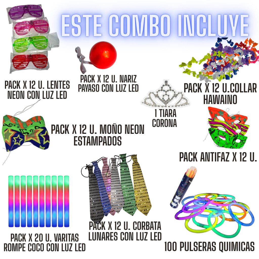¡Transforma tu celebración en una fiesta inolvidable con este super combo de Cotillon Luminoso y Estampado! Diseñado para 80 personas, este set incluye todo lo necesario para iluminar y animar tu evento.